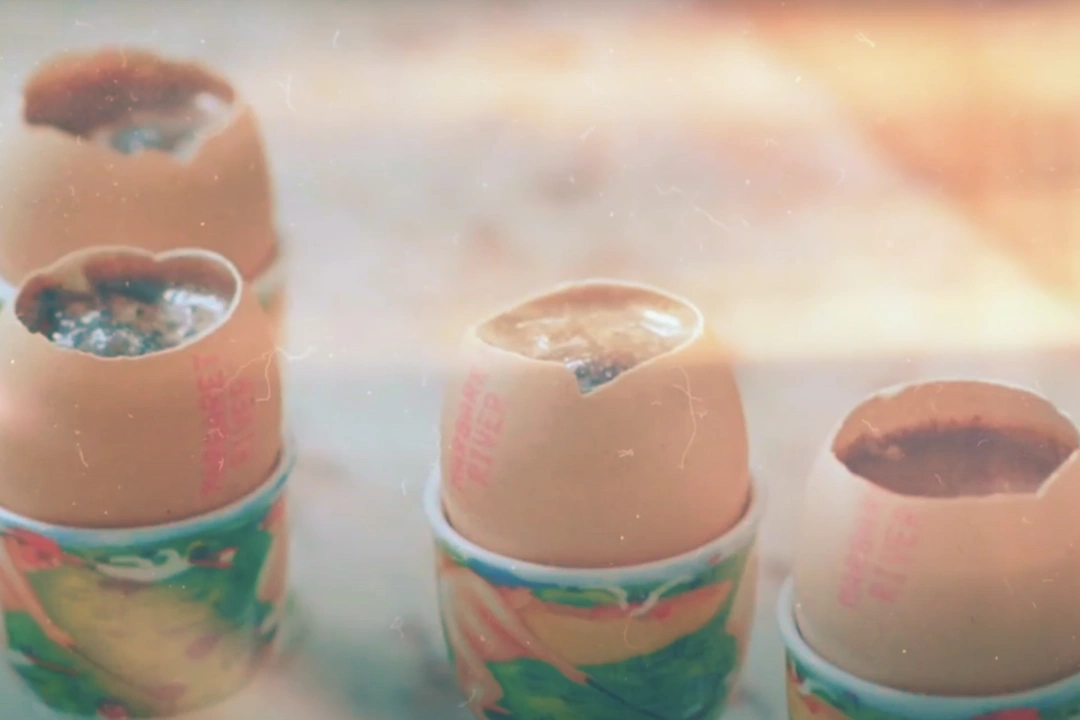 - Use the “tock” tool to gently vibrate and crack the tops of the eggs.